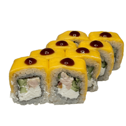 Состав спайси соус, икра масаго, авокадо, сыр плавленый , креветка темпура Вес220 г.