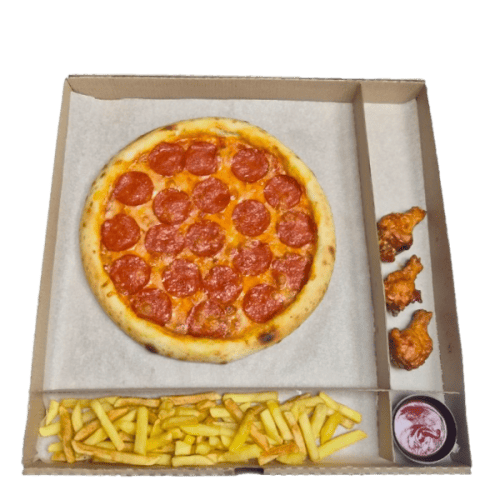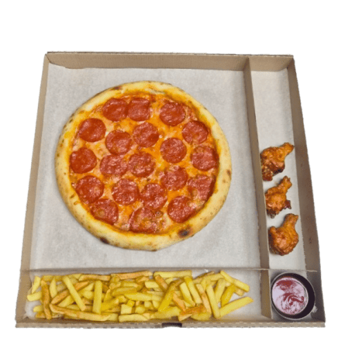 Пицца Пеперони 30см., крылышки BBQ 3 шт, картофель фри/картофельные дольки , кетчуп / соус сырный (Вес: 670 г.)